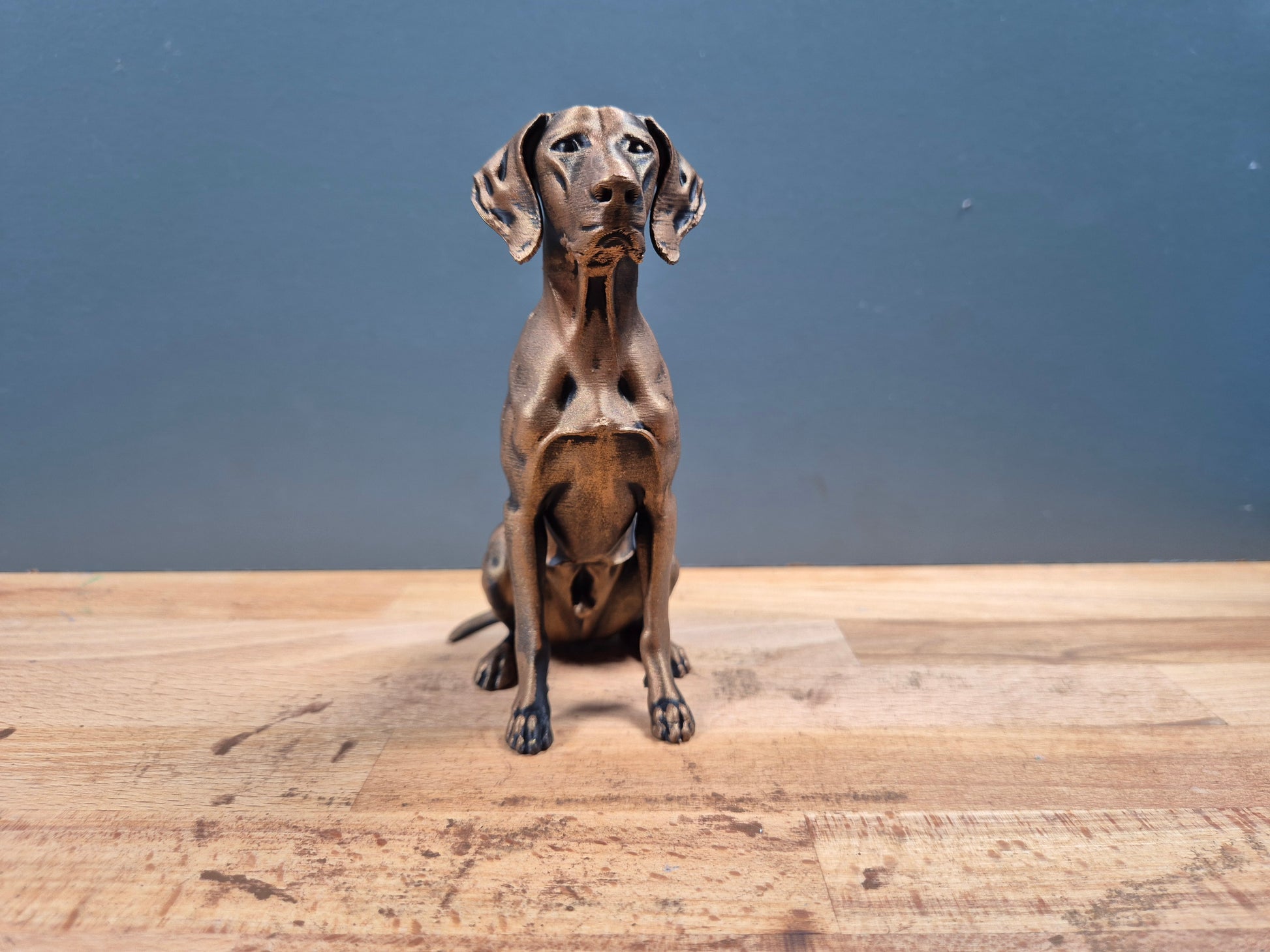 Denne dekorative hundefigur forestiller en korthåret hønsehund, en elegant og arbejdsivrig jagthund kendt for sin intelligens, udholdenhed og samarbejdsvilje. Figuren er udformet med flotte detaljer, hvor den slanke og atletiske kropsbygning, de lange ben og det opmærksomme udtryk giver et naturtro og dynamisk udseende. Den siddende position fremhæver hundens rolige koncentration og dens karakteristiske holdning, som ofte ses hos racen, når den er fokuseret og klar til opgave.