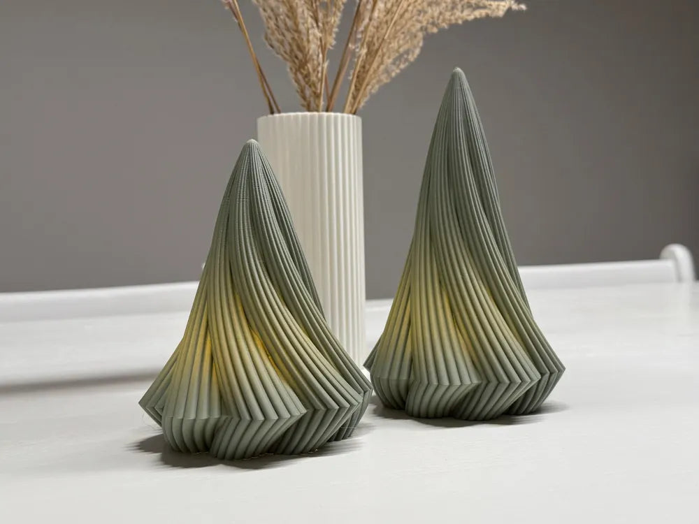 Hvert træ er 3D-printet med en åbning i bunden, der passer til et LED fyrfadslys. Når lyset tændes, vil det blidt skinne gennem materialet og skabe en stemningsfuld og hyggelig atmosfære - ideelt til vindueskarmen, reolen eller julebordet.